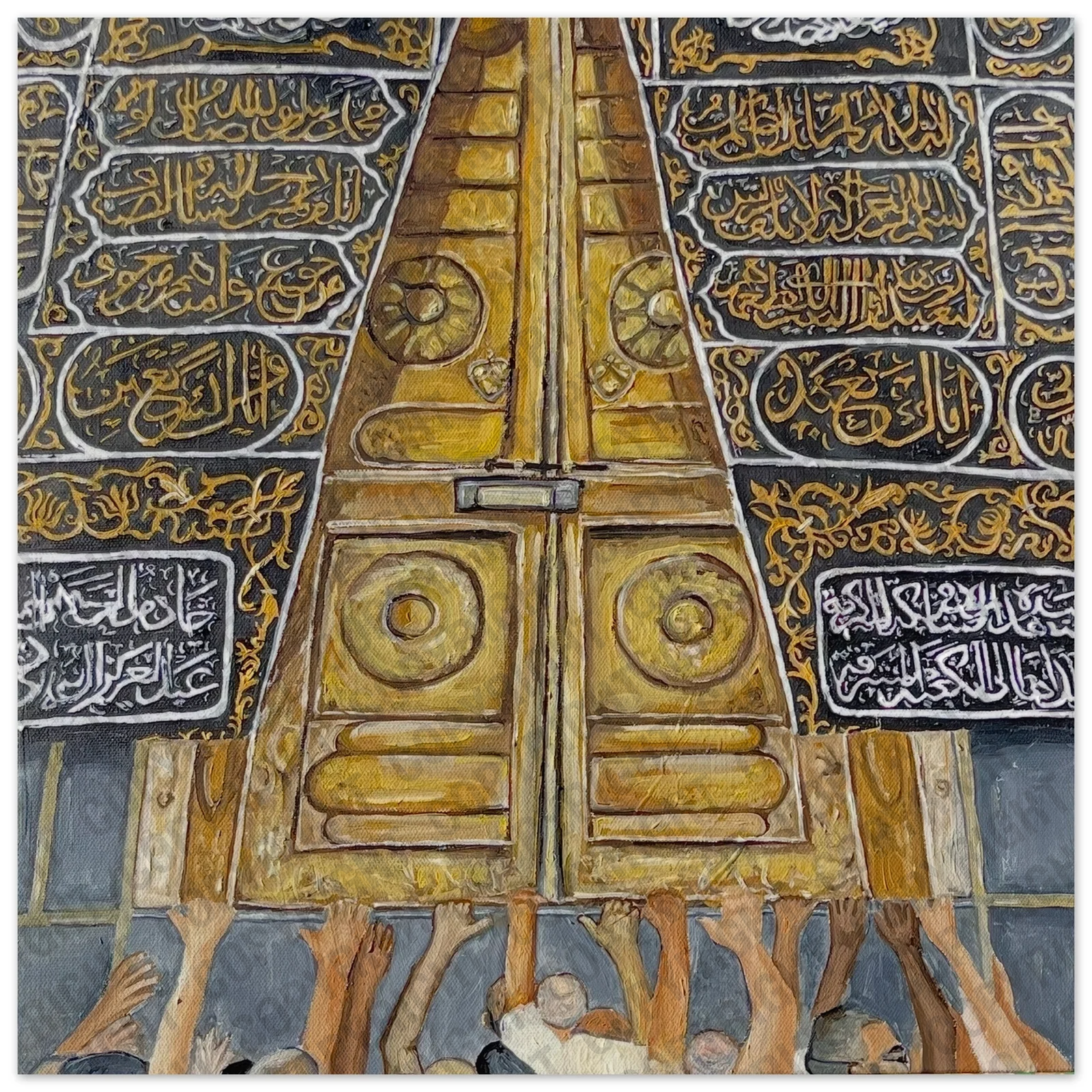 Golden Gate (50 × 50 cm) is a high-quality fine art print of my original artwork. The piece captures the sacred threshold of the Kaaba, where outstretched hands reach in longing and devotion – exploring themes of nearness, reverence, and the human desire to touch what is holy, where faith becomes both movement and stillness in the same moment.