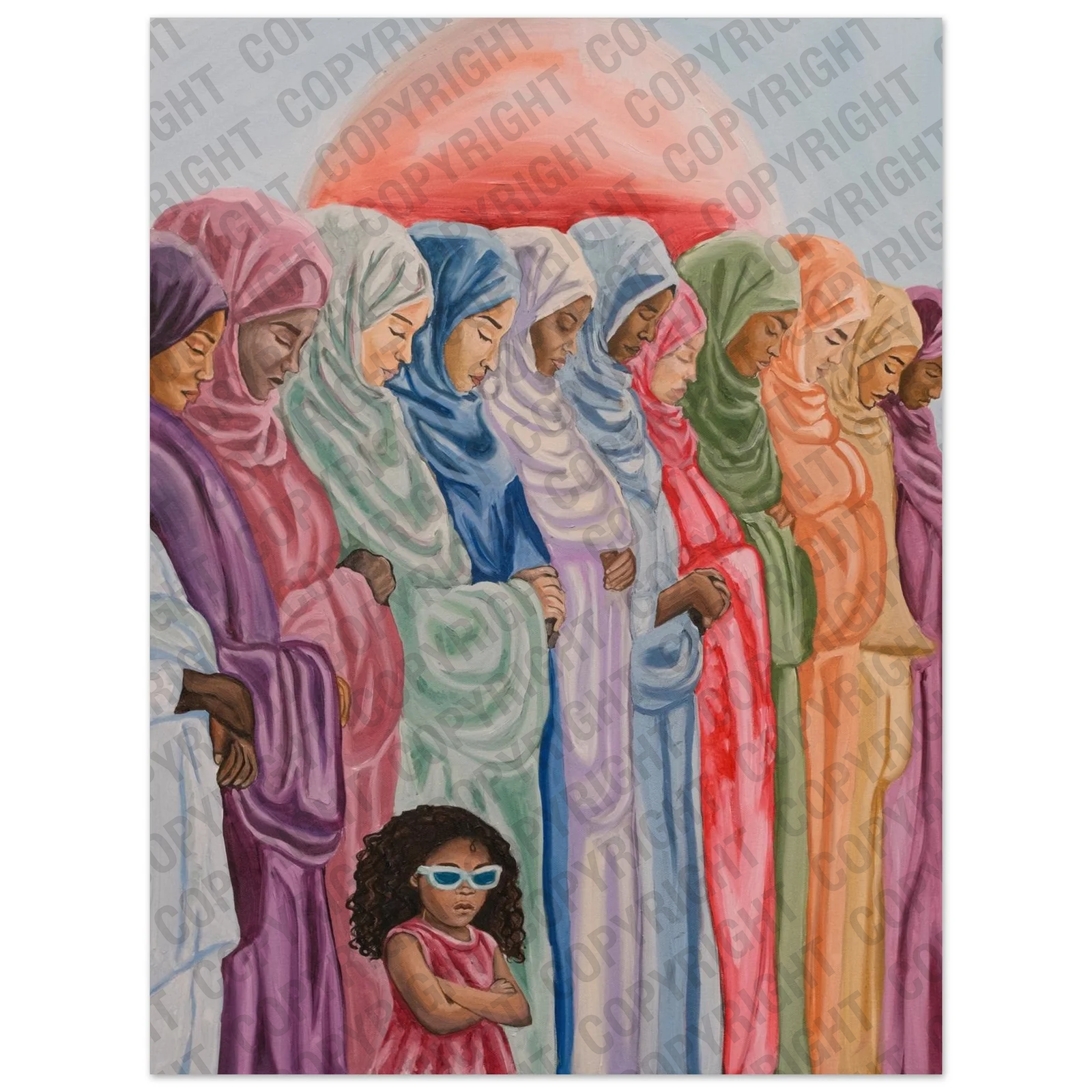 Jummah II (60 × 80 cm) is a continuation of the original work – reimagined through a feminine lens. Created as the female counterpart to Jummah I, it carries the same spiritual stillness while shifting the perspective toward softness, resilience, and inner devotion. Rooted in the quiet strength of Friday prayer, the piece reflects a moment of presence, introspection, and sacred connection – where femininity and faith exist in harmony.