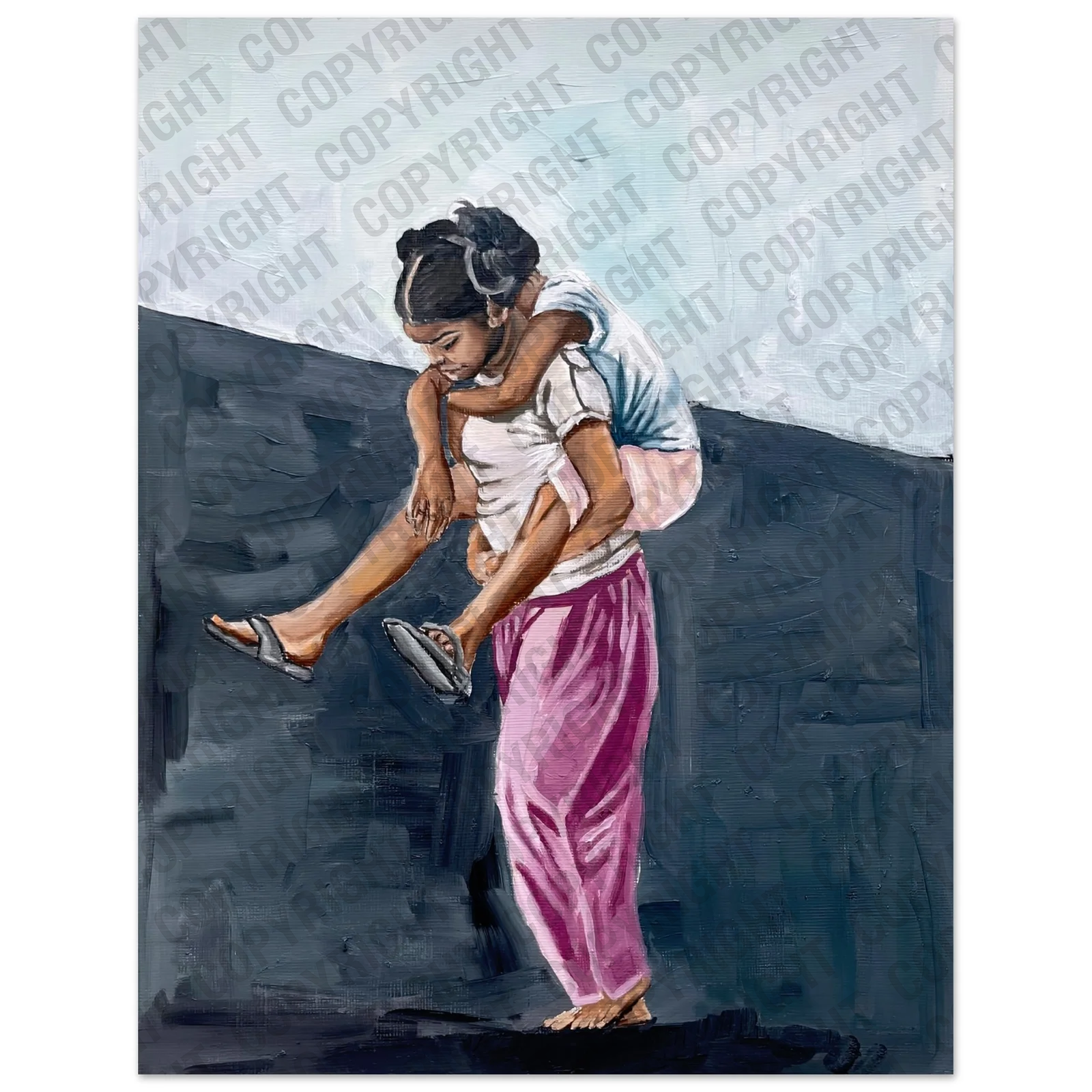 Sisters (27 × 35 cm) is a high-quality fine art print of my original artwork. The piece captures an intimate moment between two sisters and explores themes of care, responsibility, and quiet resilience – where tenderness and burden coexist in a single gesture.
